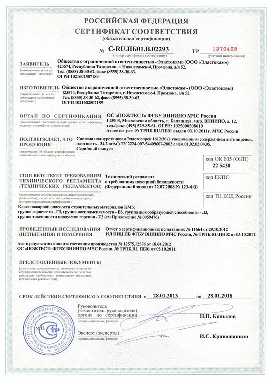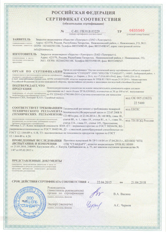 Пенополиуретан (ППУ) является самозатухающим и трудновоспламеняемым материалом. Он не поддерживает горение (Г2) и имеет класс пожарной опасности КМ3 - практически не выделяет вредных веществ.